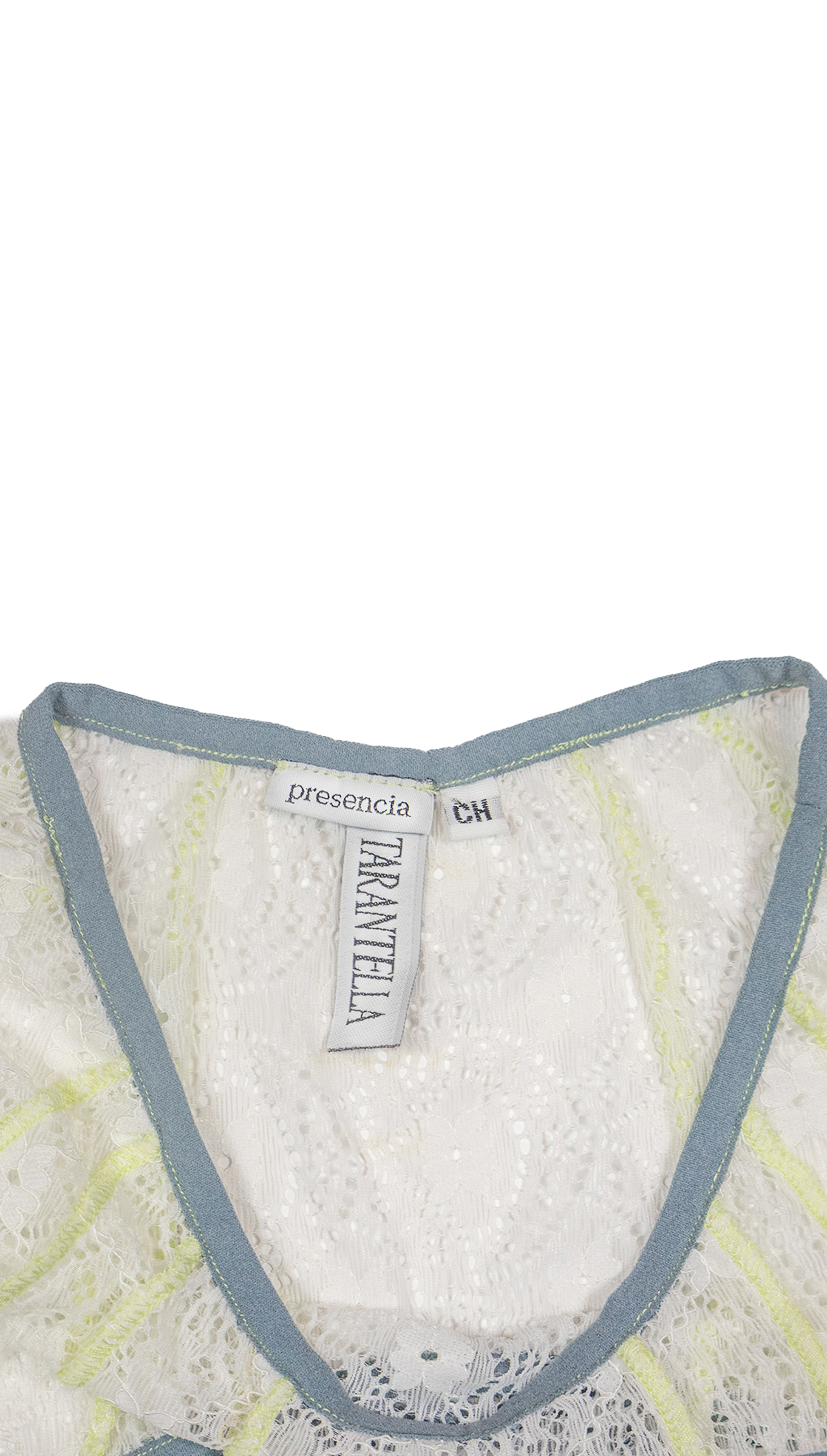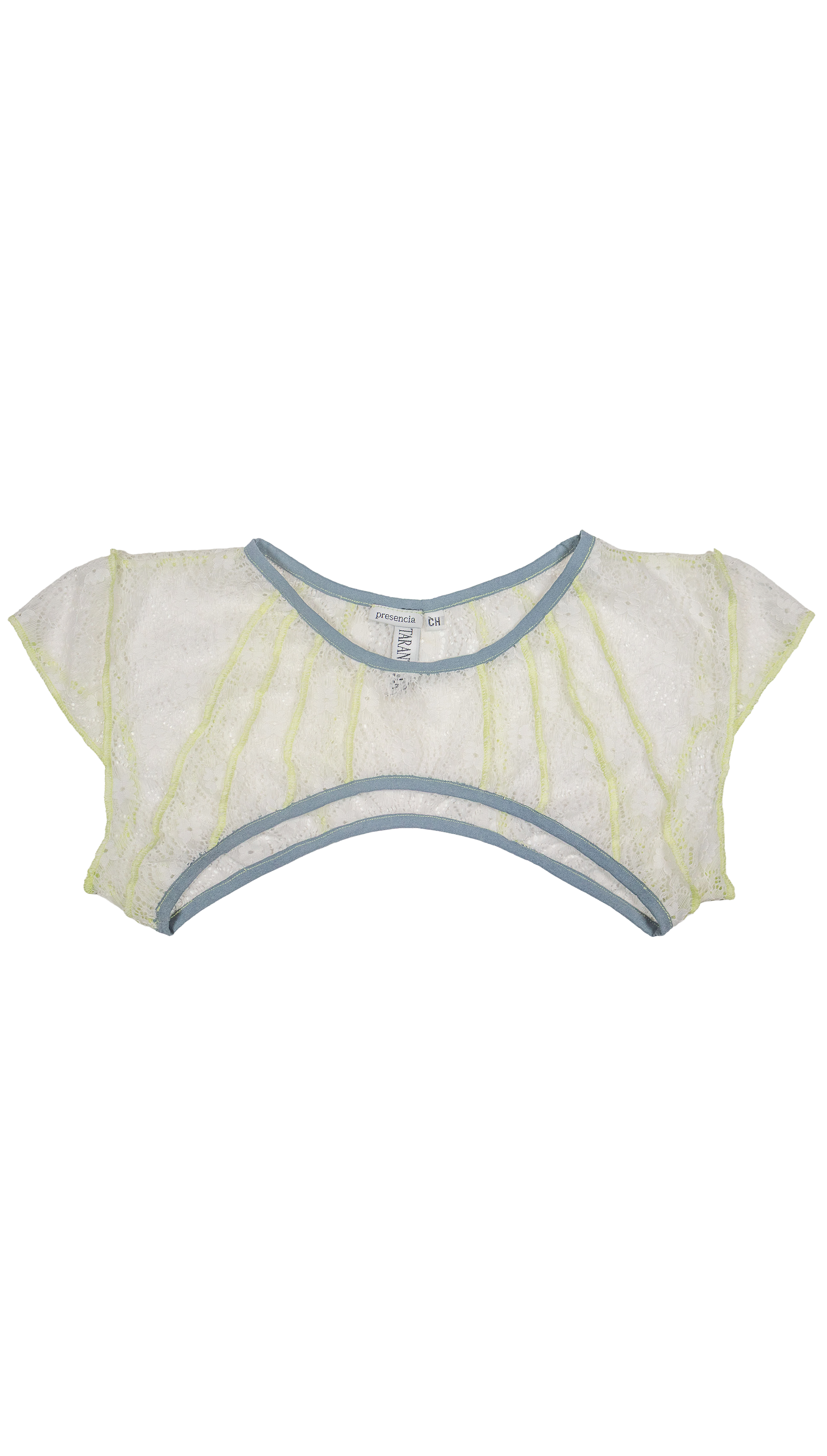 Mini Mini top, escote redondo y costuras expuestas en verde menta. Encaje reciclado.