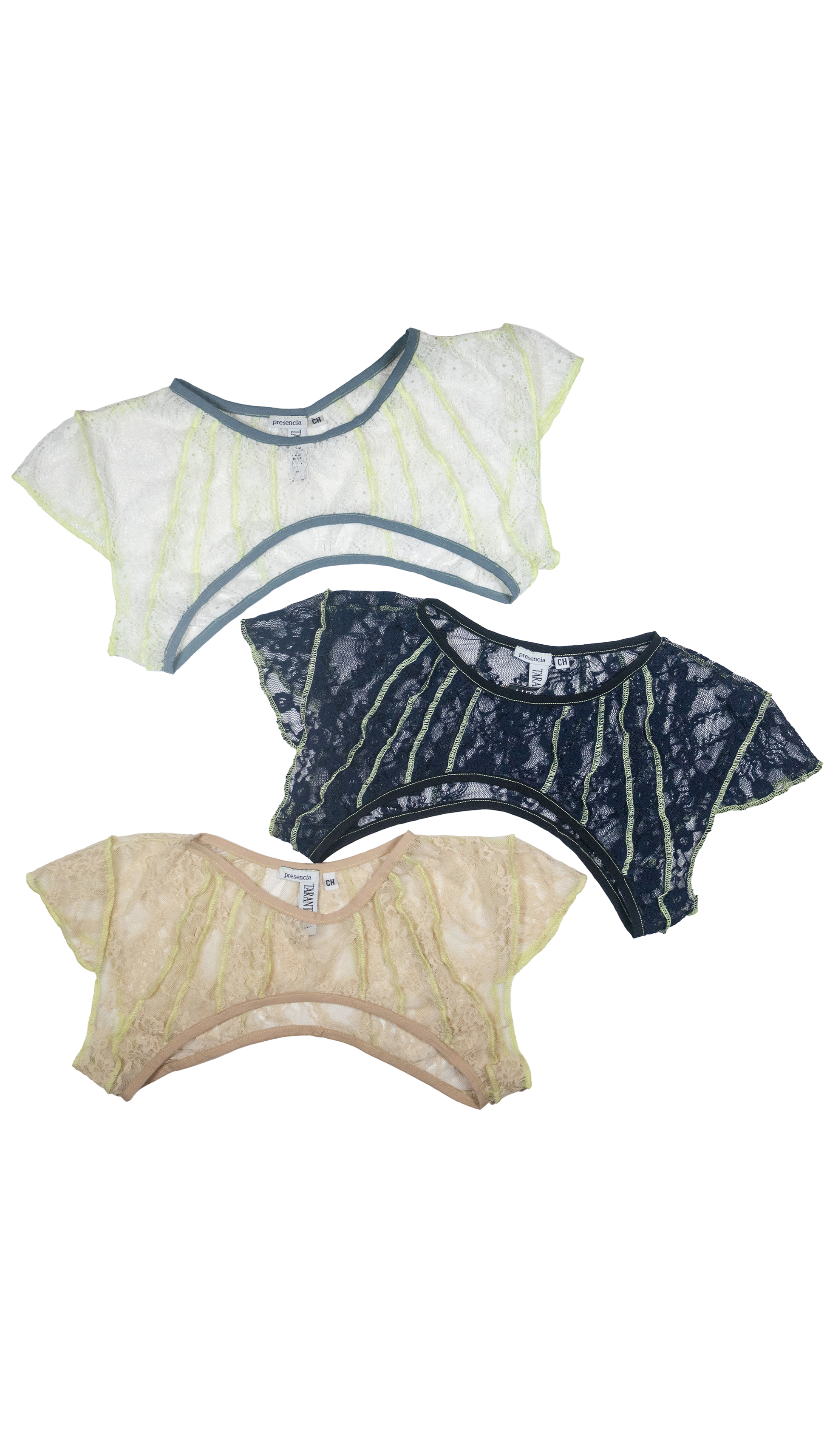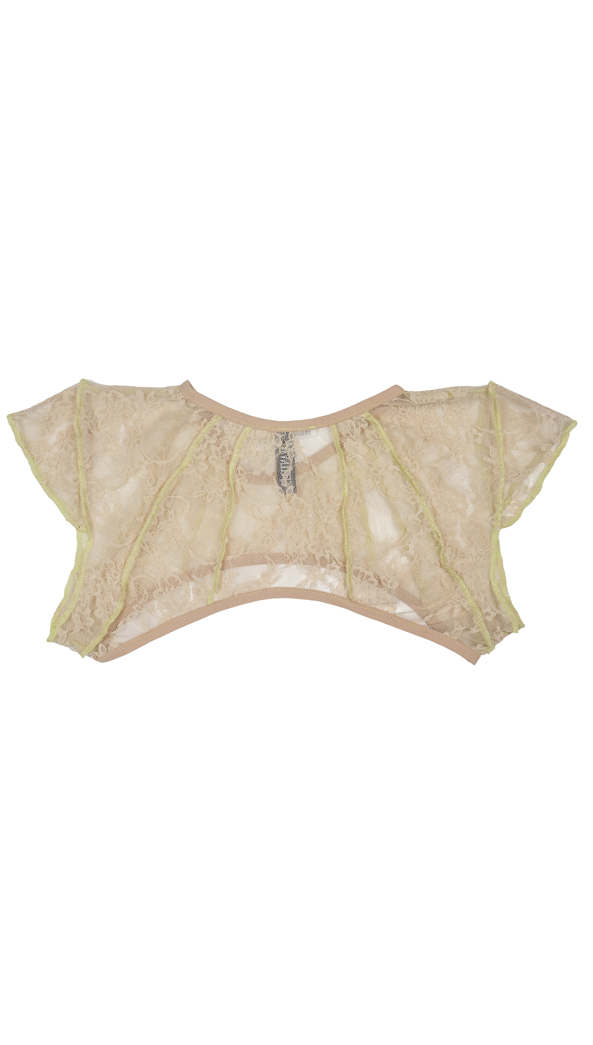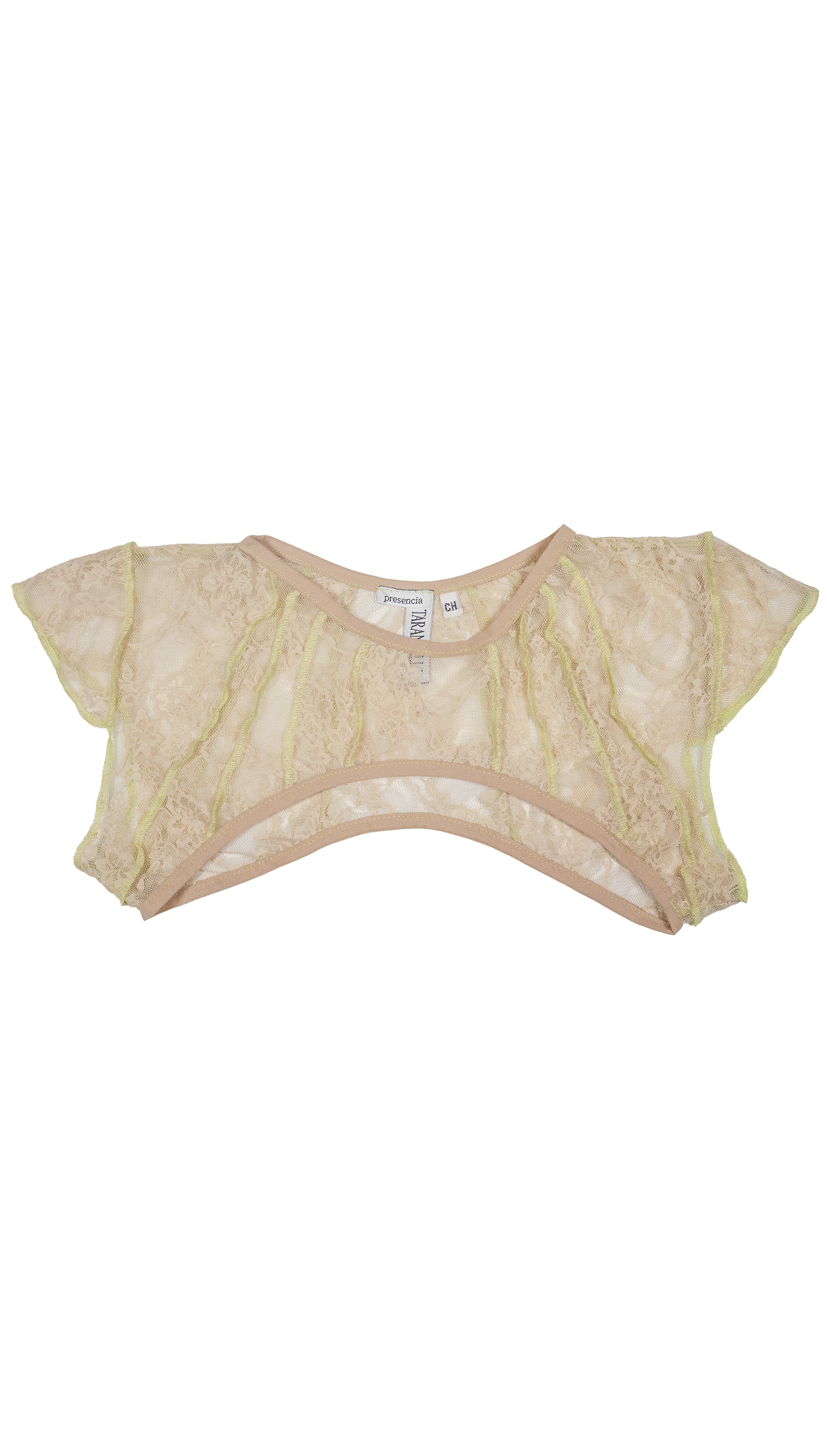 Mini Mini top, escote redondo y costuras expuestas en verde menta. Encaje beige con bies elástico nude.