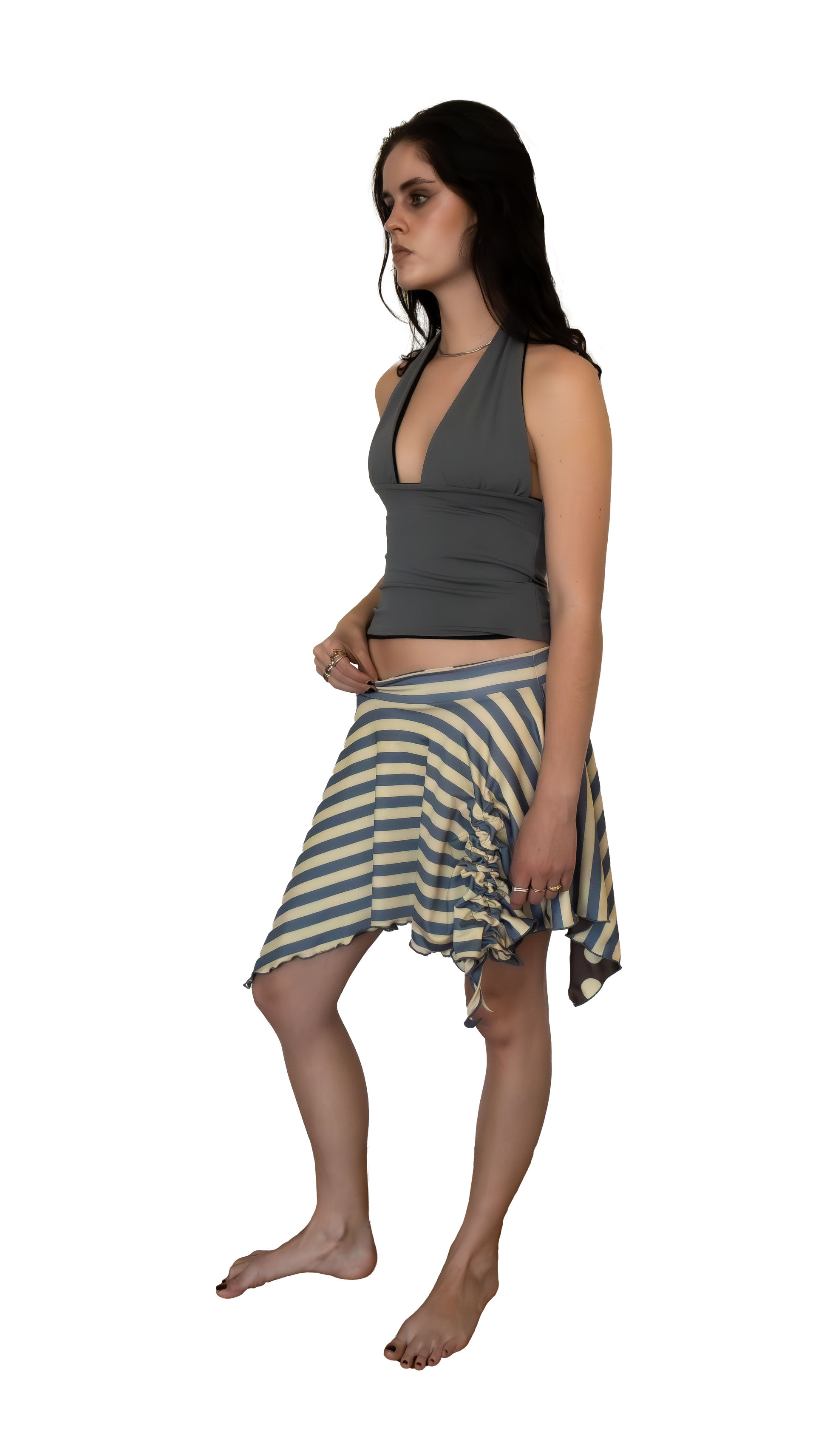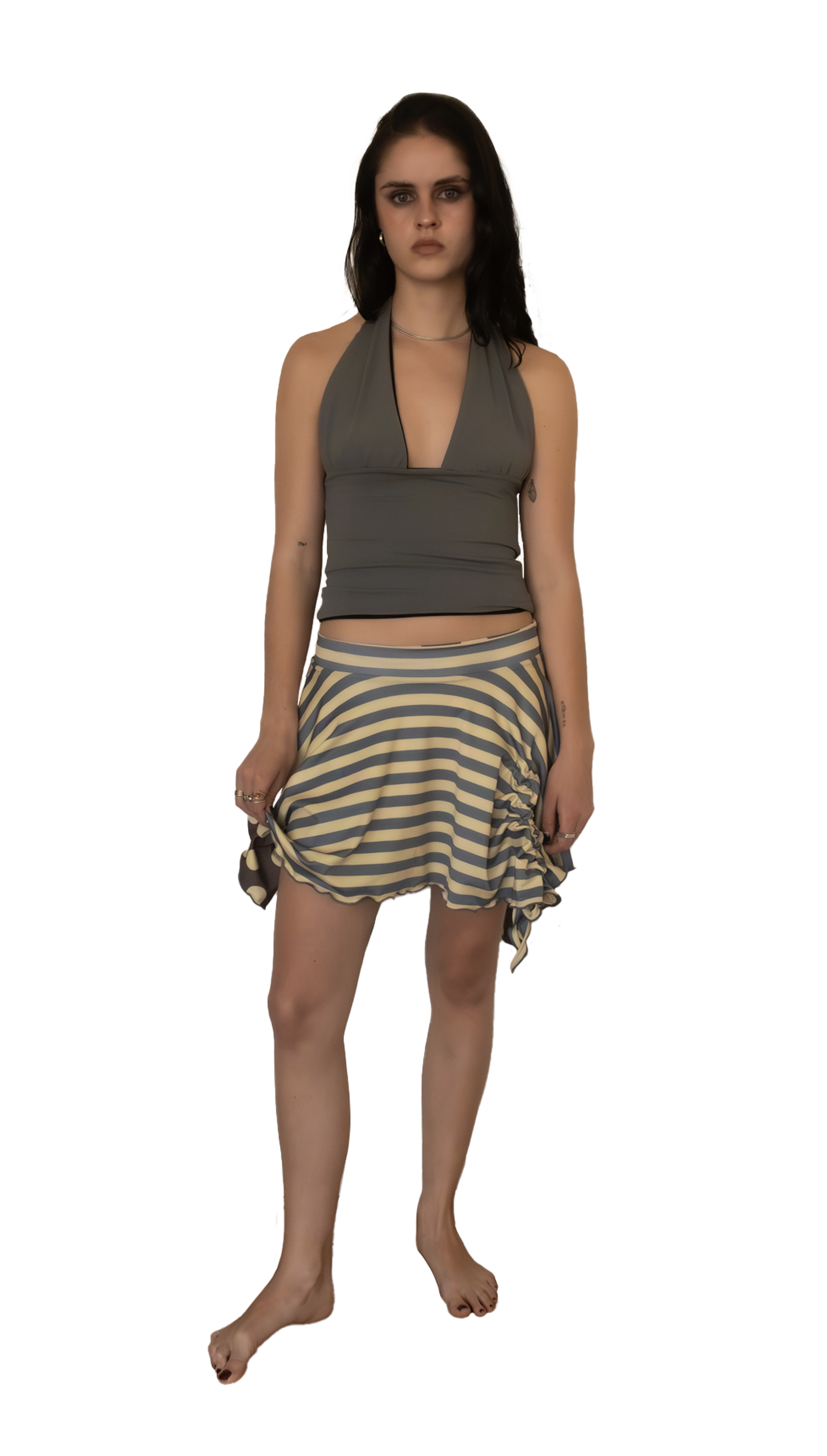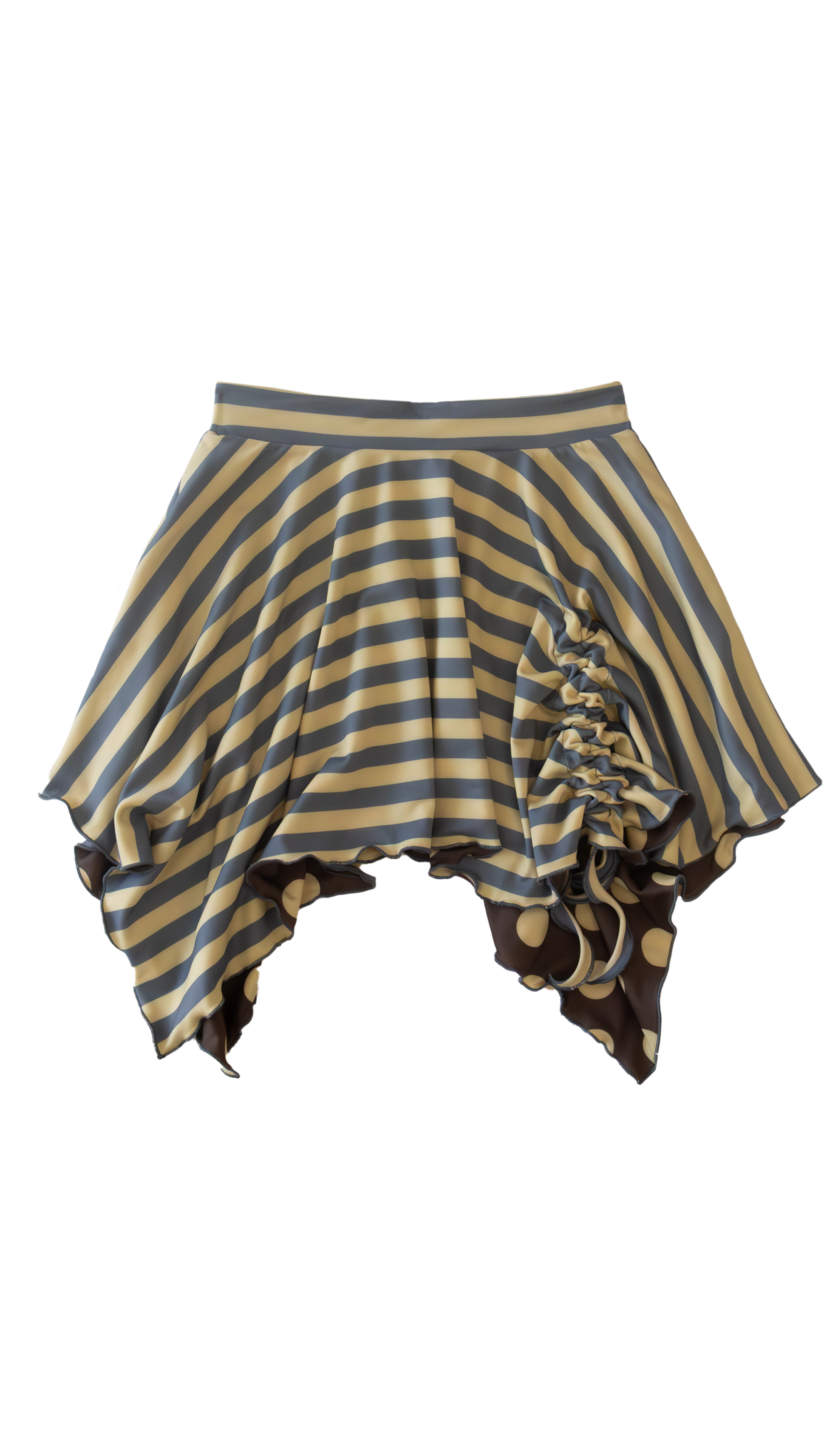 The mini version of our Nimara skirt brings the “It Girl” energy into a hotter form. It moves like a second skin… steady, soft, and always ready for motion. Now fully reversible, polka dots on one side, stripes on the other. Scrunchies built for playing, adjusting, and shifting the silhouette.